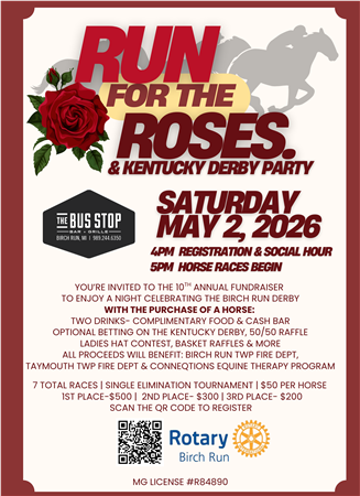 The Rotary Club of Birch Run will host the 10th Annual Run for the Roses Kentucky Derby Fundraiser Party at The Bus Stop Paddock & Grille in Birch Run on Saturday, May 2, 2026.